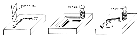 圖1.10 數(shù)控鉆床加工示意圖  圖1.11 數(shù)控銑床加工示意圖  圖1.12 輪廓控制系統(tǒng)加工示意圖
